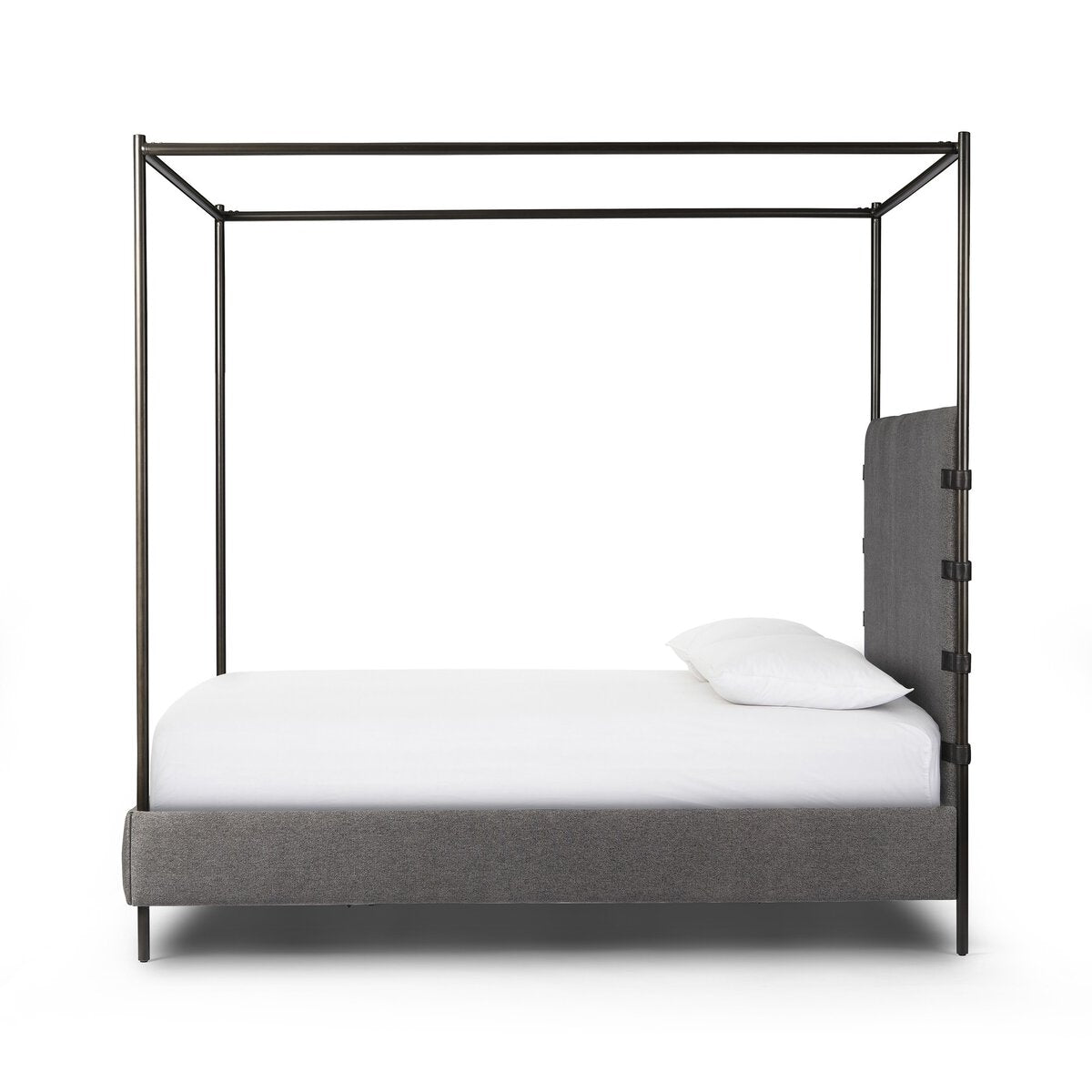 Bring texture into play. This iron canopy bed features a headboard upholstered in a versatile grey fabric with decorative faux leather straps.