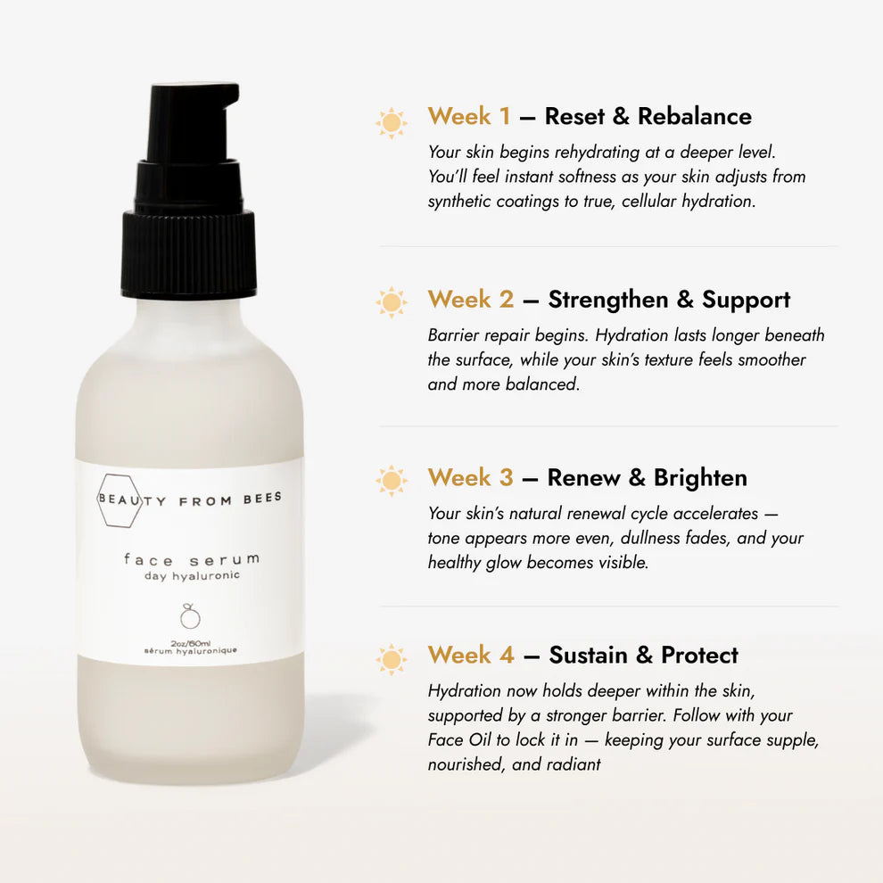 How to use: For radiant skin that feels deeply hydrated, start with a dime-sized amount of our Day Face Serum. Gently pat it over your entire face, neck, and eye area.