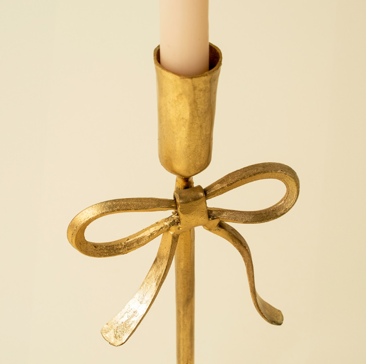 Add a touch of charm to your accent decor with the Bow Forged Candlestick in Gold. Made in Moradabad, India, a city celebrated for its traditional metalwork, this delicate candle holder features a hand-forged bow that feels both romantic and refined. Its petite scale is perfect for styling on side tables, mantels, or as part of a layered tablescape. Finished in warm gold, it pairs beautifully with taper candles to create a soft, inviting glow.