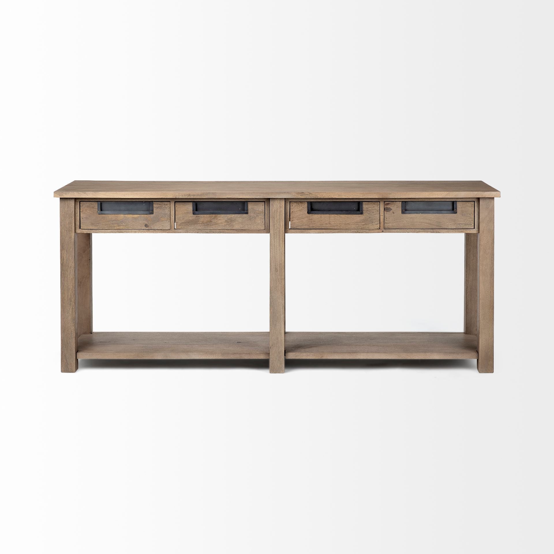 Crafted from Indian Mango wood finished in a natural brown tone, the Harrelson III is a stylish console table from the Harrelson series. It sports four sliding drawers and an open shelf at the bottom that allow you to store a mix of your favorite accessories and other smaller items with ease. Matte-black polished, iron pull handles are standard on the sliding drawers and allow for convenient access to stored items. The Harrelson III is a functional and stylish piece of furniture that fits perfectly in spaces based on the Farmhouse,