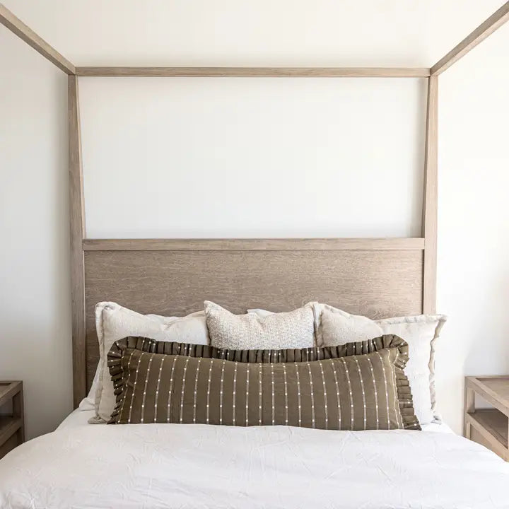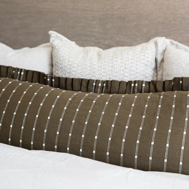 The Ruffle Bolster Pillow Dark Olive Green White Stripes is crafted from premium cotton. This pillow not only creates a luxurious feel but also ensures durability and easy maintenance.