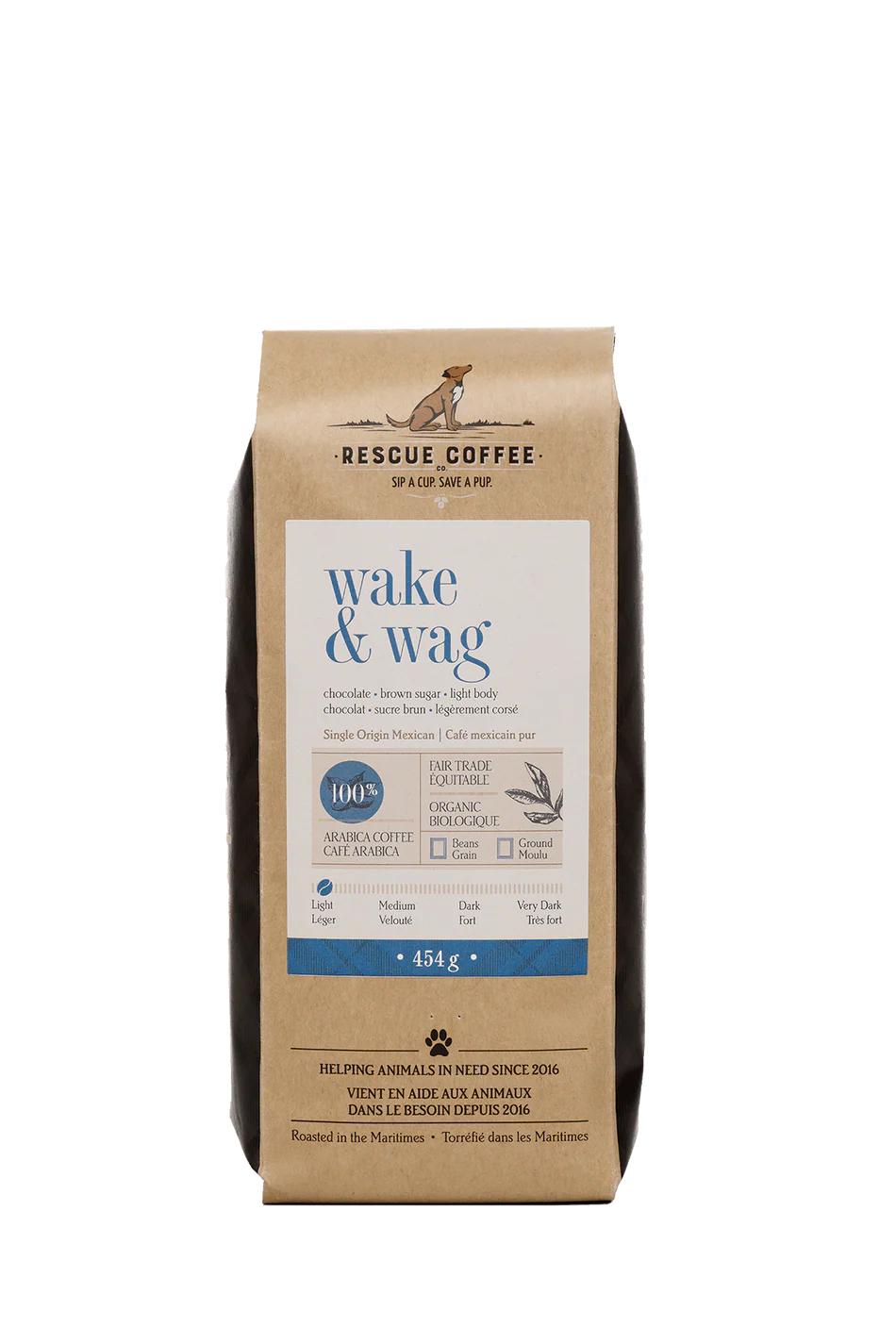 Wake & Wag is a premium light roast coffee offered by Rescue Coffee Co., crafted to invigorate your mornings with its delicate flavors and ethical sourcing.